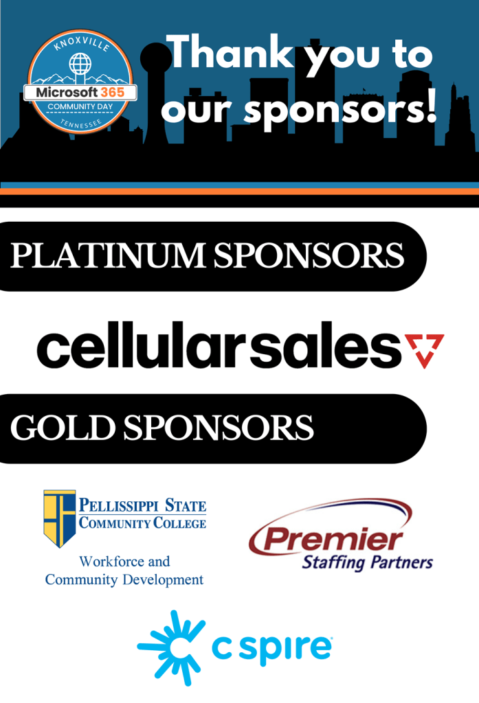 2024 Knoxville Microsoft 365 Community Day Dates: Feb 29 – March 1, 2024 Venue: Pellissippi Blount County Campus, Workforce Development Building 2/29 Workshop Day: 3 rooms 3/1 Session Day: 3 rooms, 23 sessions Registration: 189 Event Site GALLERY SPONSORS